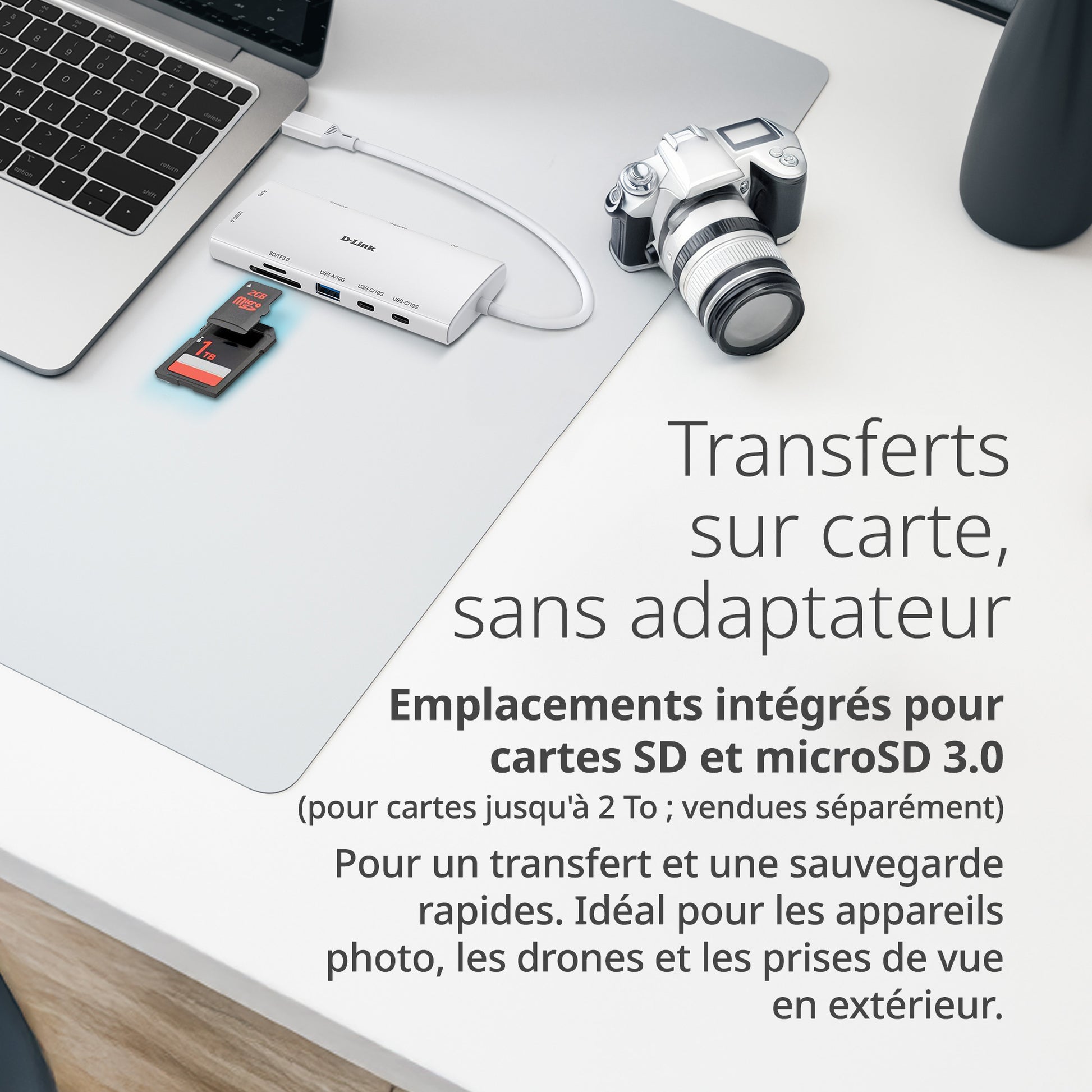 Transférez rapidement vos photos, vidéos et fichiers grâce aux emplacements pour cartes SD et microSD. Que vous souhaitiez effectuer des montages en déplacement ou sauvegarder vos vidéos, le hub USB-C 10-en-1 D-Link (DUP-A01) vous simplifie la vie et simplifie l'utilisation, sans adaptateur supplémentaire.