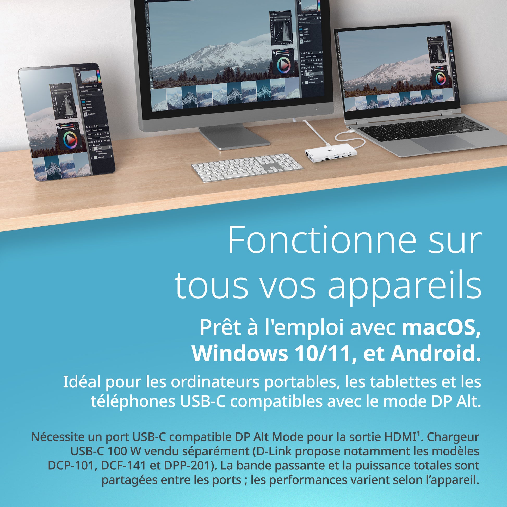 - Notes de compatibilité (lecture rapide) : Nécessite un port USB-C avec mode DP Alt pour la sortie HDMI1. Chargeur USB-C 100 W vendu séparément (les options D-Link incluent les modèles DCP-101, DCF-141 et DPP-201). La bande passante/puissance totale est partagée entre les ports ; les performances varient selon l'appareil.