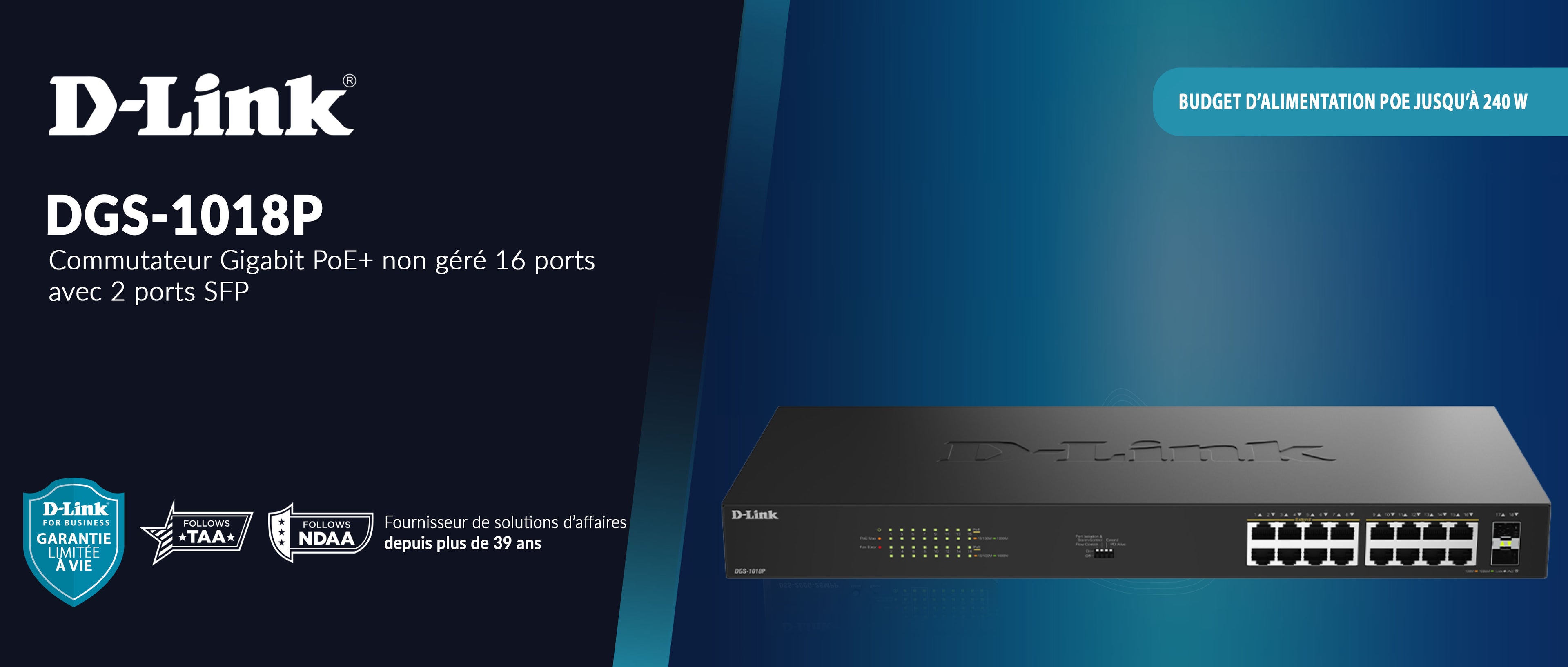 Commutateur non géré D-Link Gigabit PoE+ 16 ports avec 2 ports SFP (DGS-1018P) – Budget 240 W, 30 W/port, Plug-and-Play, commandes intégrées, QoS, ventilateur intelligent, conforme aux normes NDAA/TAA