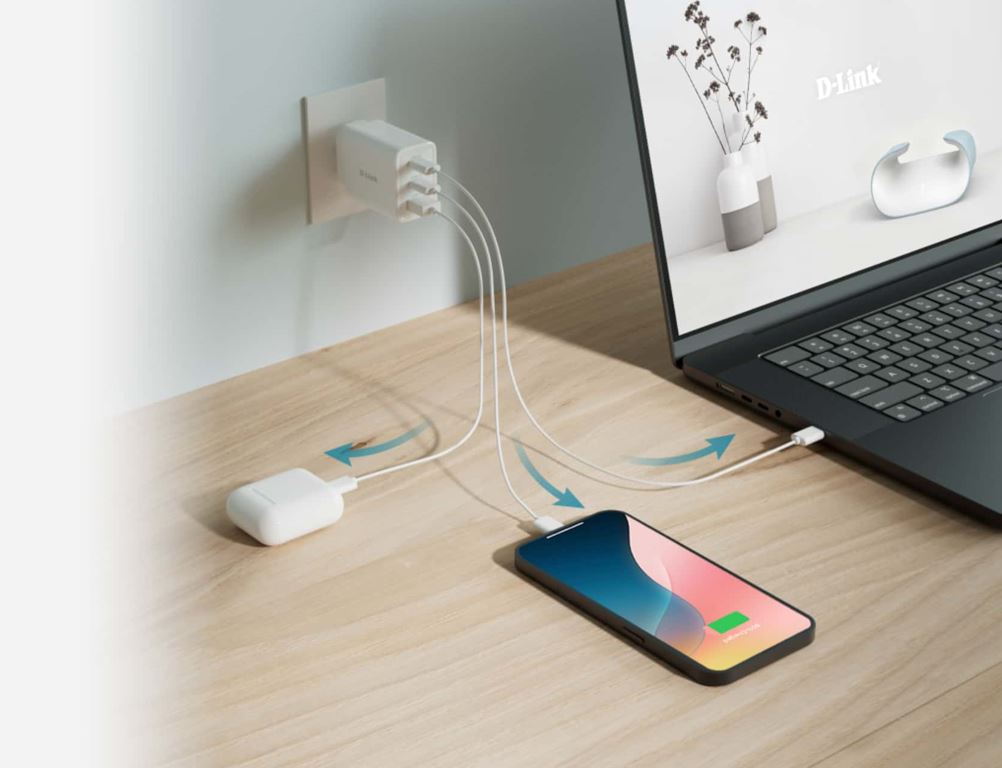 Des réunions matinales aux pauses du soir, le chargeur GaN 65 W de D-Link (DCP-651) vous permet de recharger vos appareils en continu. Avec deux ports USB-C et un port USB-A, vous pouvez recharger simultanément votre ordinateur portable, votre téléphone et votre montre connectée*, à la maison, au travail ou où que vous soyez. Un chargeur compact. Productivité maximale.