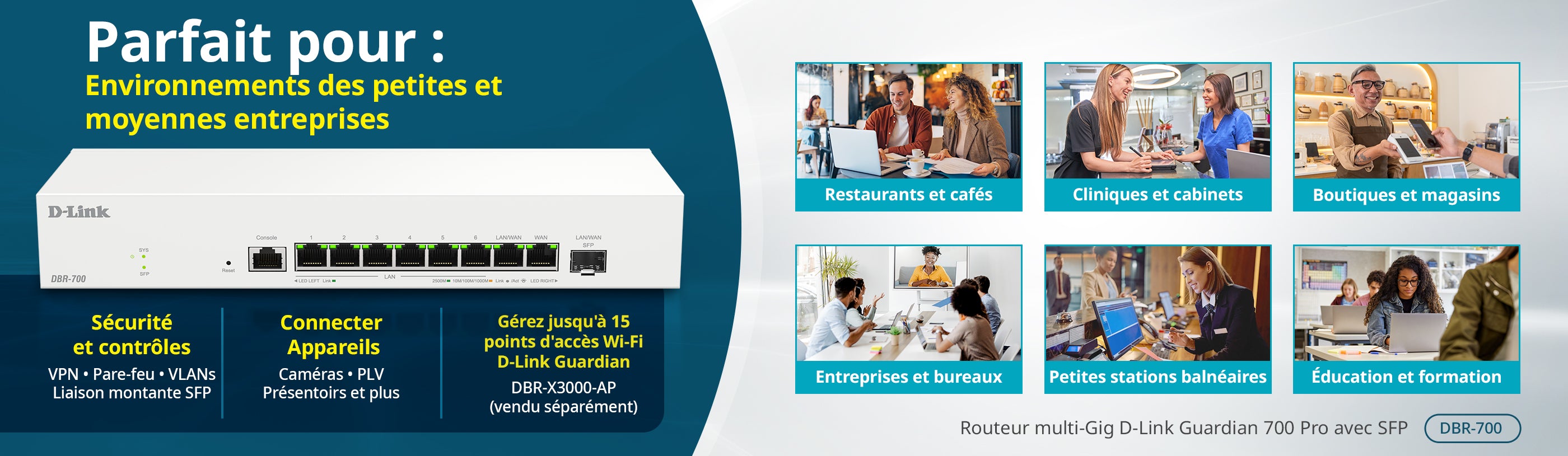 Conçu pour les petites et moyennes entreprises , que vous gériez une salle de classe, un supermarché, un complexe hôtelier de charme, un restaurant, une clinique, une chaîne de magasins ou une entreprise en pleine croissance, le routeur multigigabit D-Link Guardian 700 Pro avec SFP (DBR-700) vous aide à connecter, optimiser et faire évoluer votre réseau d'entreprise, sans avoir besoin de service informatique ni d'abonnement.