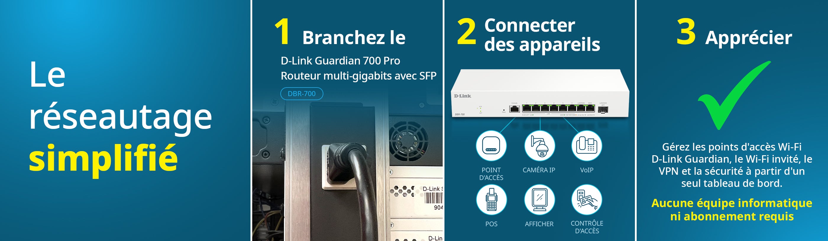 - Routeur D-Link Guardian 700 Pro avec SFP lorsque vous avez besoin d'une liaison montante fibre et d'une capacité accrue de points d'accès D-Link Guardian sur site.