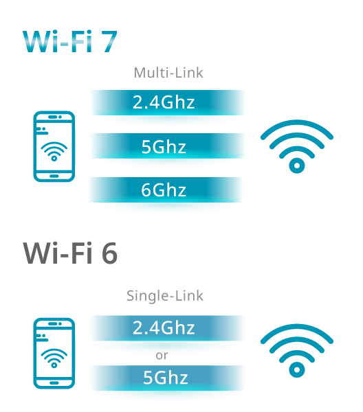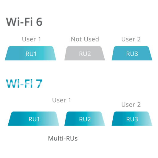 Wi-Fi 7 can assign multiple Resource Units to a single device, unlike Wi-Fi 6 which only supports one at a time. This improves transmission efficiency and allows more flexible use of network capacity.