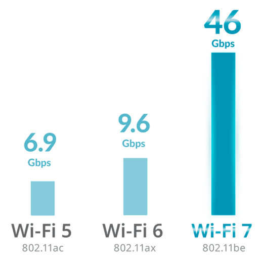 With 46 Gbps speeds, Wi-Fi 7 uses wider channels and better modulation for lag-free streaming, smooth gaming, and high-speed work, even with multiple devices connected.