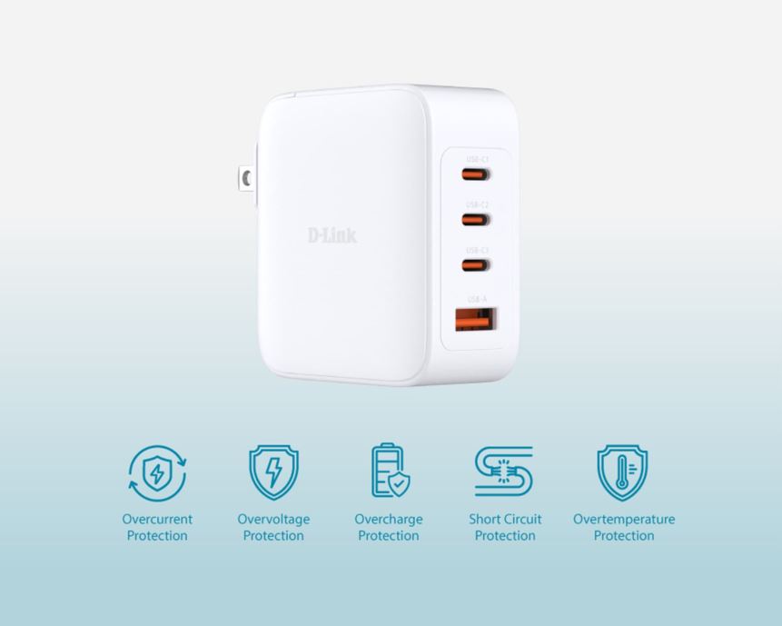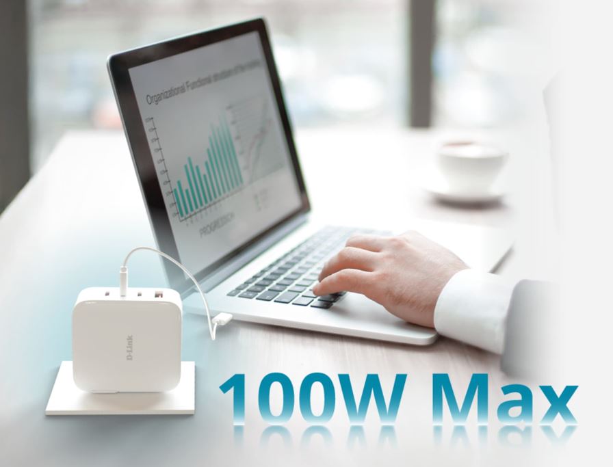 D-Link 100W 4-Port GaN Wall Charger-3 x USB-C Port Fast Charging Adapter (Max 100W/20W)-1 x USB-A (Max 18W). Compatible with MacBook Pro Air, iPad Pro, iPhone, Galaxy and more.