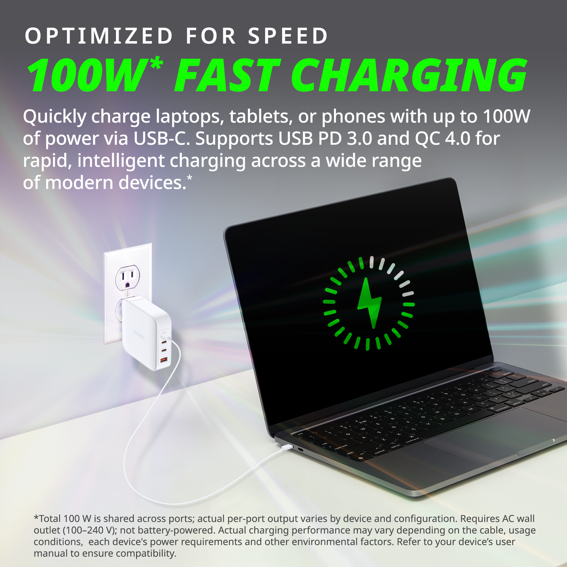 *Total 100W is shared across ports; actual per-port output varies by device and configuration. Requires AC wall outlet (100–240 V); not battery-powered. Actual charging performance may vary based on cable, usage conditions and each device's power requirements. Refer to your device’s user manual to ensure compatibility.
