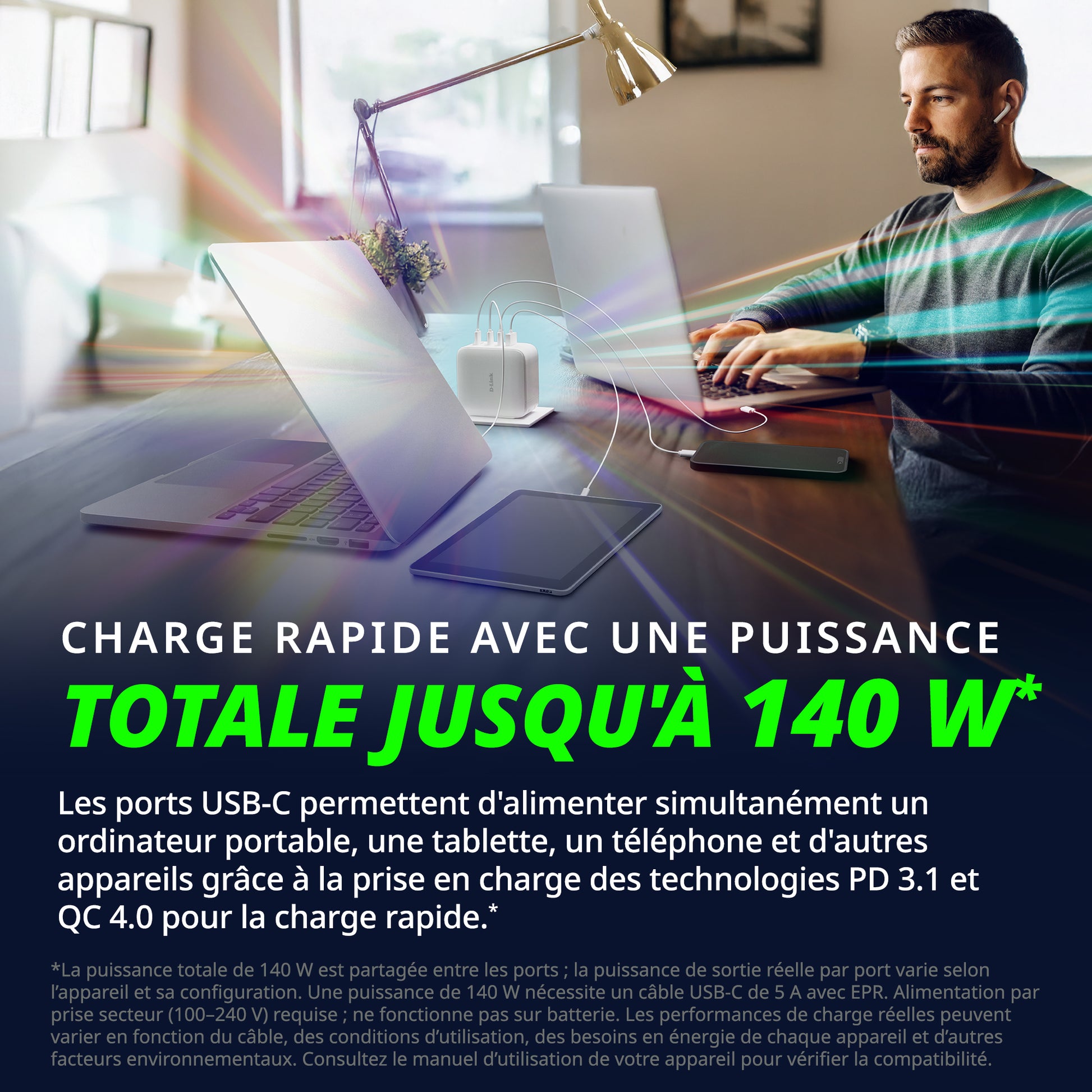 *Total 140 W is shared across ports; actual per-port output varies by device and configuration. 140 W output requires a 5 A EPR-rated USB-C cable. Requires AC wall outlet (100–240 V); not battery-powered. Actual charging performance may vary depending on the cable, usage conditions, each device's power requirements and other environmental factors. Refer to your device’s user manual to ensure compatibility. Rate, Power, Distance, and Speed vary with cabling, temperature, devices, and other environmental factors.