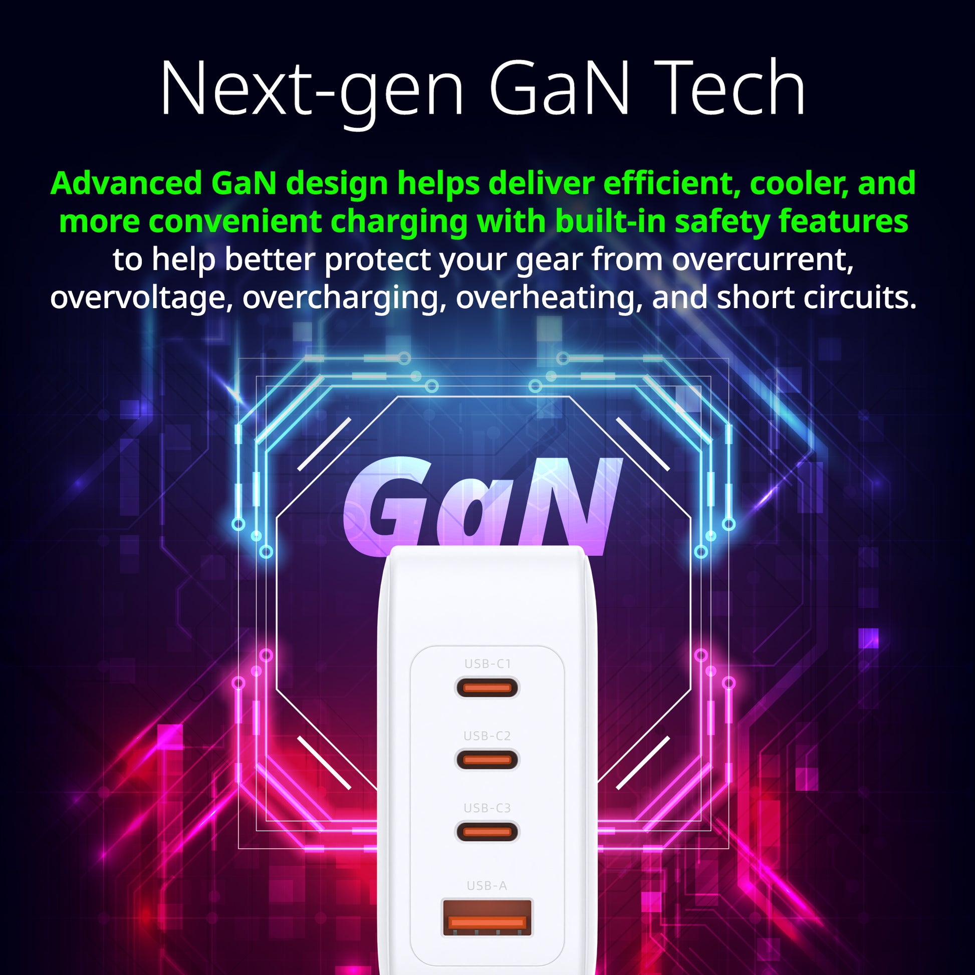 - NEXT-GEN GaN TECH – Advanced GaN design helps deliver efficient, cooler, and more convenient charging with built-in safety features.