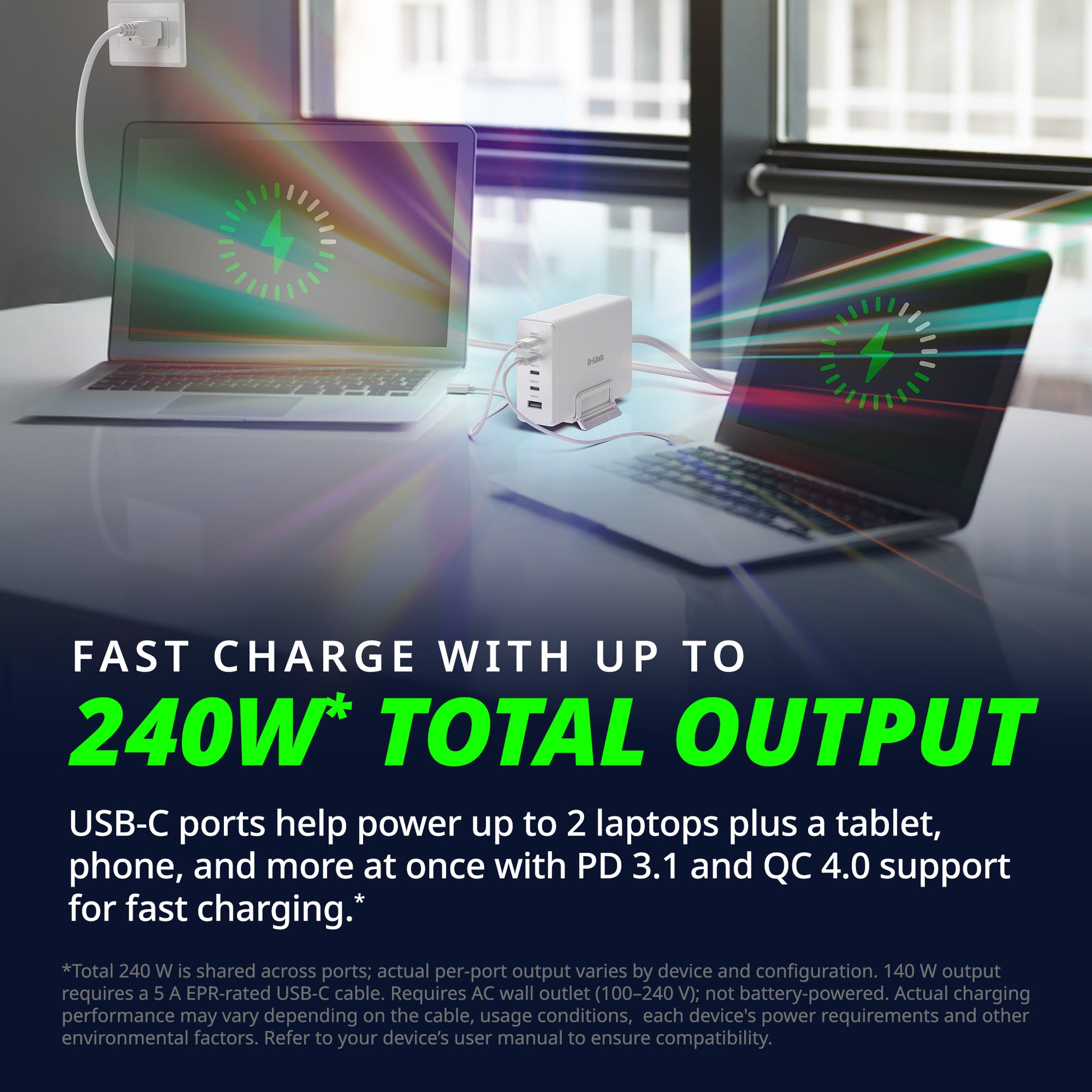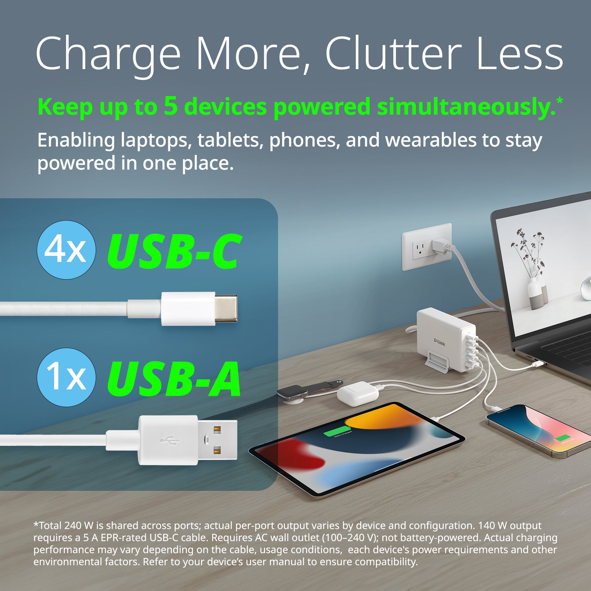 *Total 240 W is shared across ports; actual per-port output varies by device and configuration. 140 W output requires a 5 A EPR-rated USB-C cable. Requires AC wall outlet (100–240 V); not battery-powered. Actual charging performance may vary depending on the cable, usage conditions, each device's power requirements and other environmental factors. Refer to your device’s user manual to ensure compatibility. Range, Power, Distance, and Speed vary with cabling, temperature, devices, and other environmental factors.