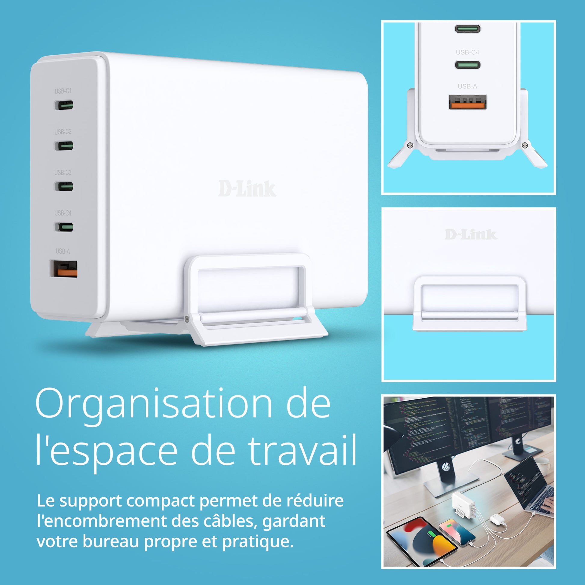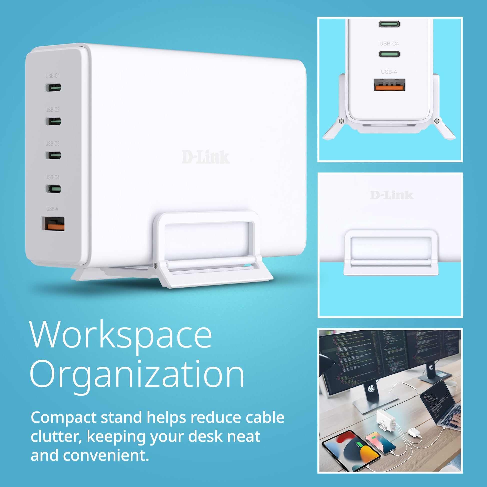 The DCF-241 240W GaN Charger powers up to five devices simultaneously*, your laptop, cell phone, tablet, smartwatch, and more via four USB-C ports and one USB-A port.* Say goodbye to cable chaos and bulky adapters. With a space-saving stand, you’ll clear away tangled cables and oversized bricks for a tidier workspace.