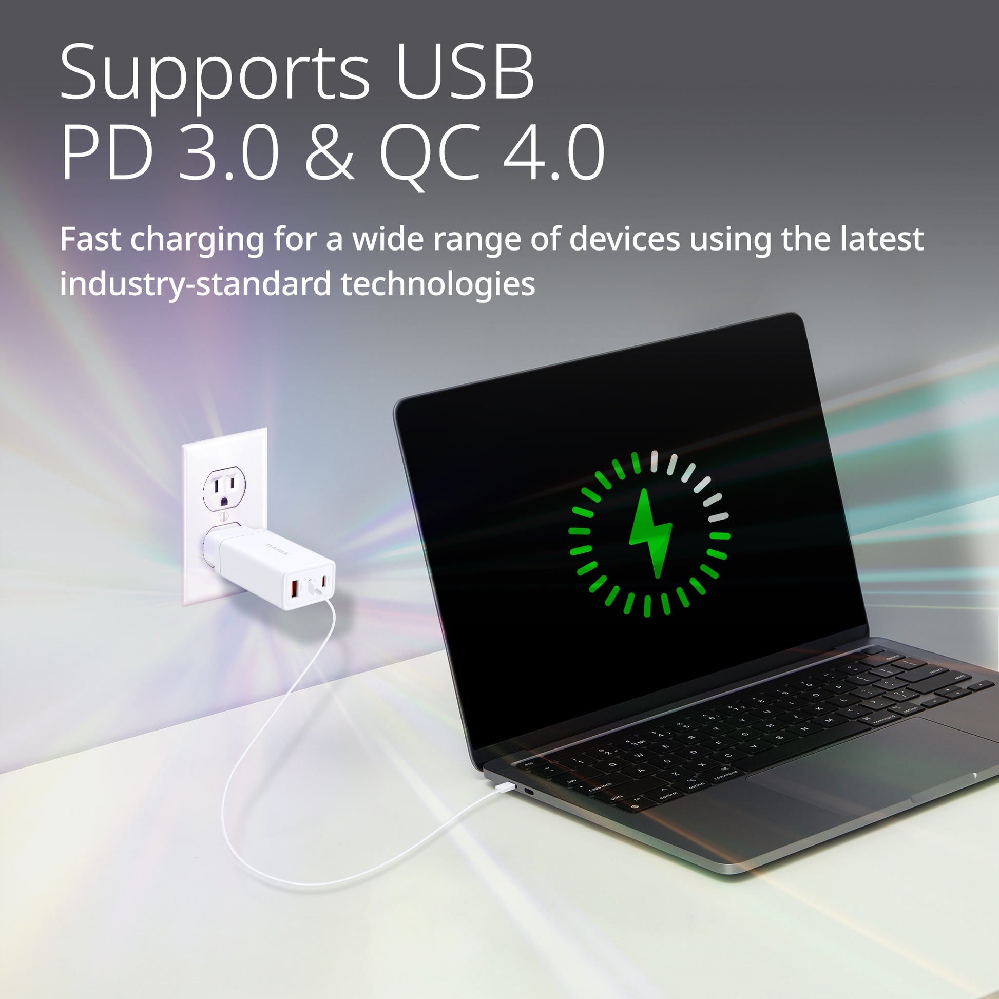 Supports USB‑C Power Delivery 3.0 (PD 3.0) and Quick Charge 4.0 (QC 4.0) to charge your laptop, phone, or tablet quickly and more safely—with no guesswork. One device does it all.*