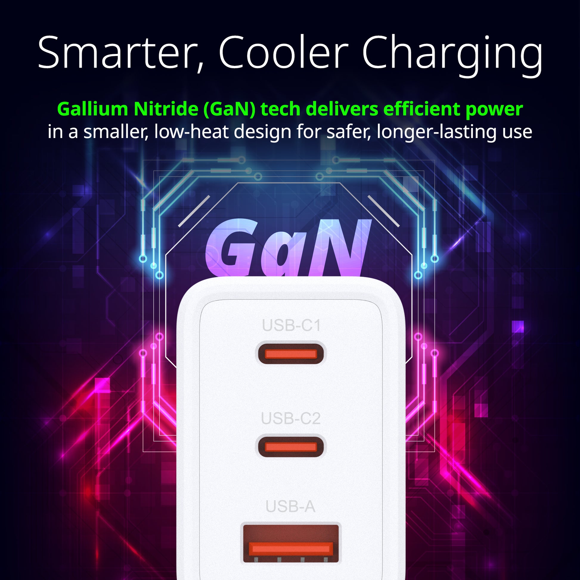 - Cooler, Smarter Charging – Gallium Nitride (GaN) tech delivers efficient power in a smaller, low-heat design for safer, longer-lasting use