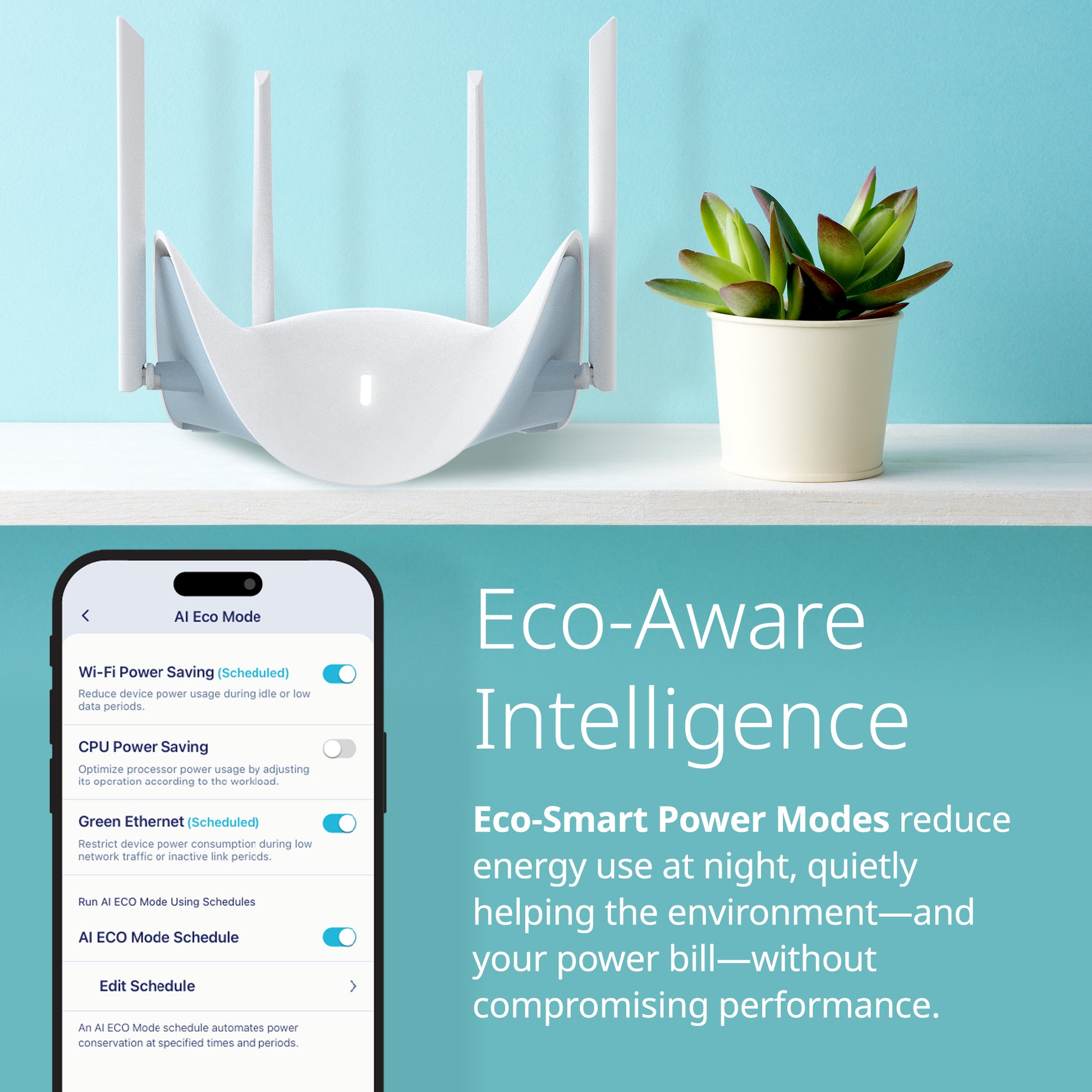 ECO Mode helps your network run leaner when demand is low—automatically scaling back wireless activity, CPU usage, and Ethernet power to reduce energy consumption***. The result? Lower bills, a longer-lasting router, and a smaller footprint on the environment—without compromising performance.