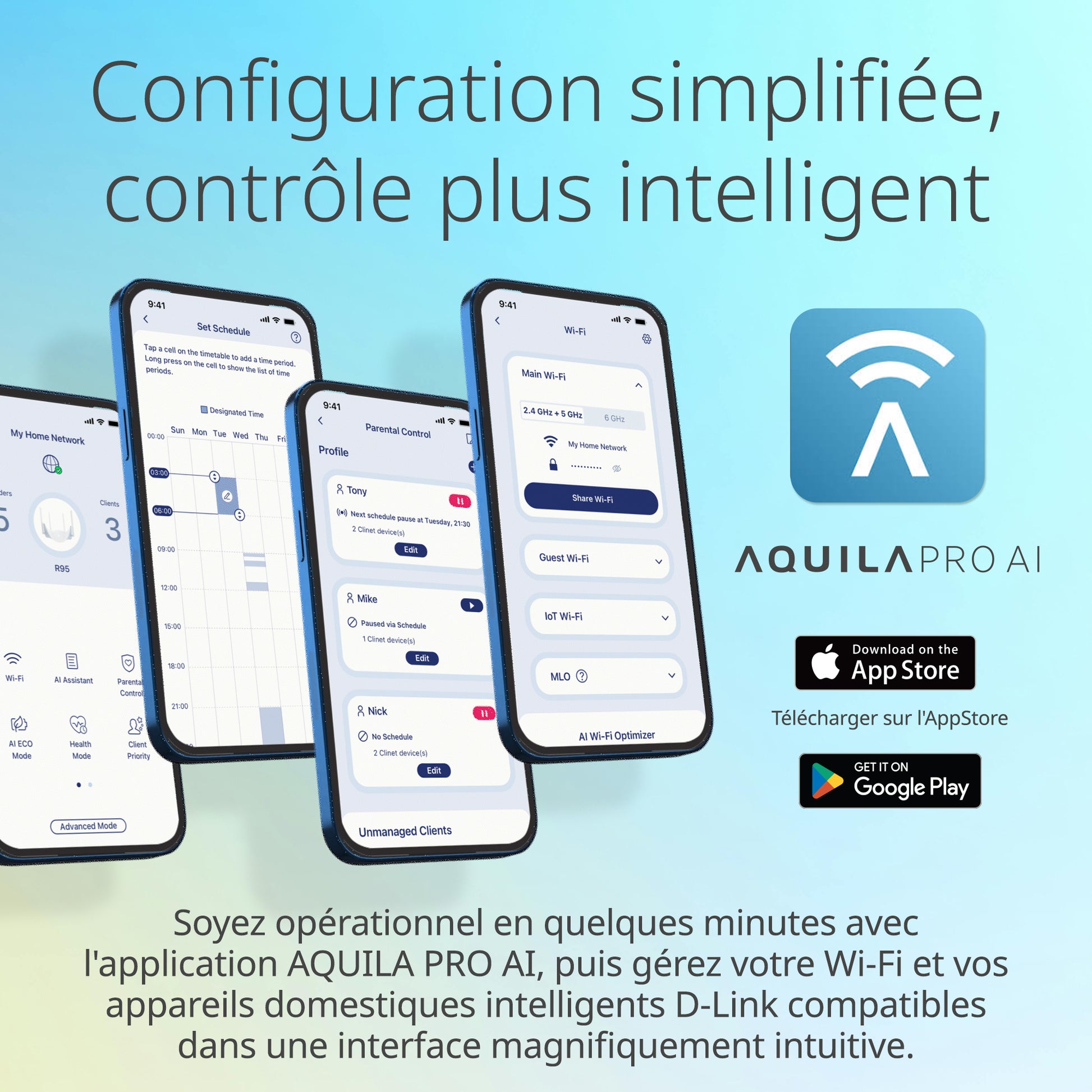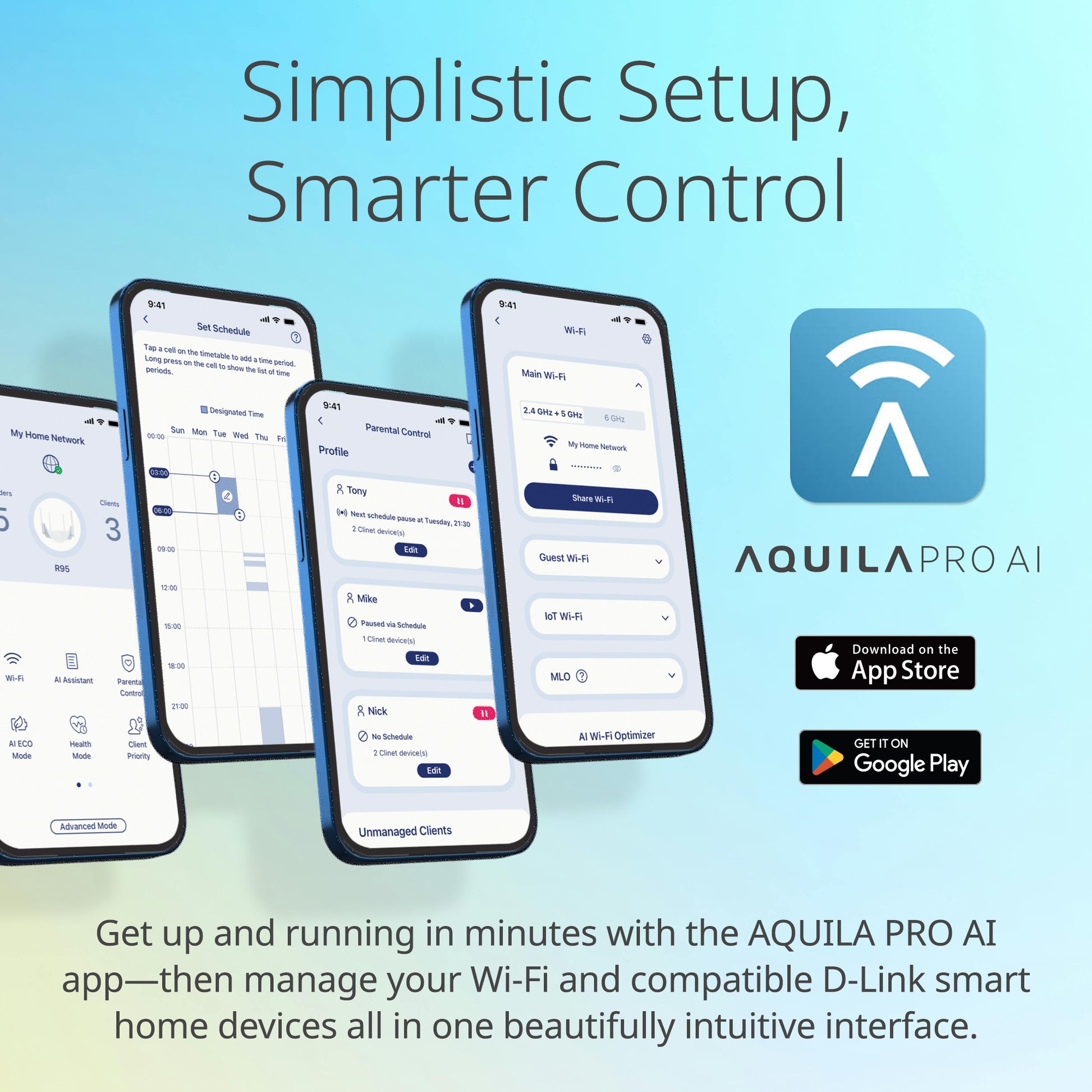 - SIMPLISTIC SETUP, SMARTER CONTROL: Get up and running in minutes with the AQUILA PRO AI app—then manage your Wi-Fi and compatible D-Link smart home devices all in one beautifully intuitive interface.